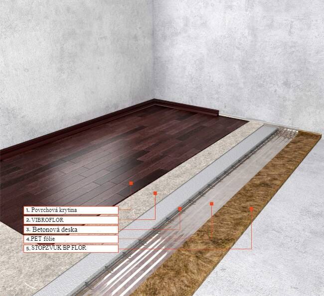 Profesionální systém založený na deskách StopZvuk BP Flor. Desky se používají jako první vrstva oddělující potěr od podlahy a stěn. StopZvuk BP Floor je tlumící materiál, který účinně zabraňuje přenosu vibrací. Tuto kombinaci doplňuje Vibrofloor sloužící jako vibrační a zvukově izolační podložka.