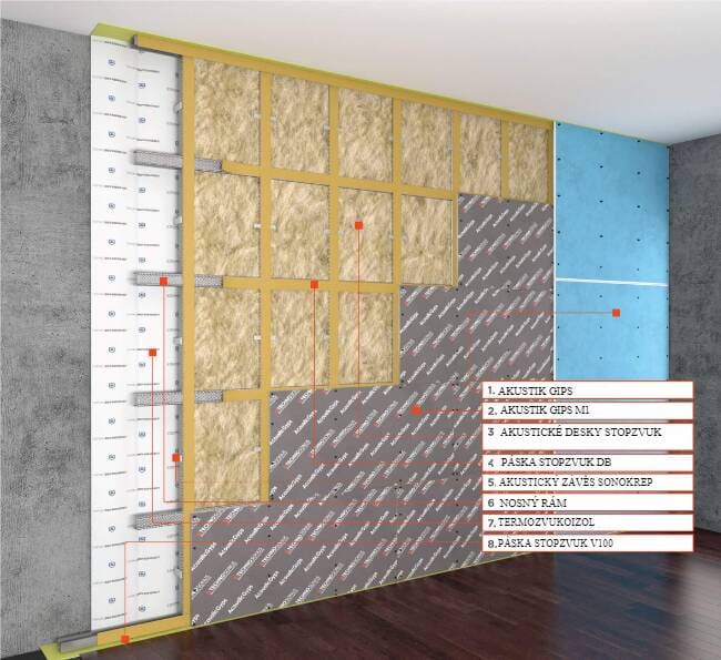 Moderní a efektivní zvukově izolační systém. Používá se ve vysoce komfortních bytových domech, hotelech, nemocnicích, lázních atd. Poskytuje místnosti akustický komfort díky ochraně před domácím hlukem přenášeným vzduchem a výraznému tlumení hluku šířeného strukturou (mechanický náraz, dupot nohou atd.). Hlavním prvkem systému je komplexní zvukotěsný panel AkustikGypsum M1.